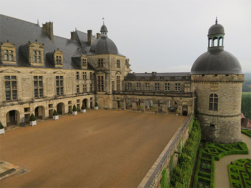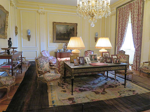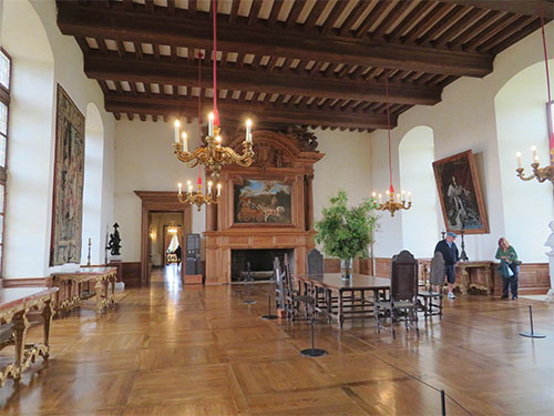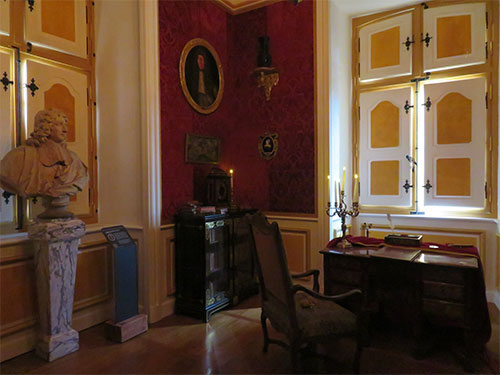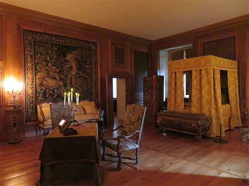 In 1961, there was a fire that destroyed a great deal of the castle. What we see today, has been restored to its original rooms. We went on a self-guided tour with a map of the castle’s journey through history. We began by walking through a large receiving room with a fireplace at each end. Then we entered the private apartments of the Marquis de Hautefort, consisting of his office, library, and sleeping chambers. In different rooms, a recording could be activated with a pushbutton, offering a conversation in English and in French. In his office, we listened to a conversation the Marquis was having with Colbert, the Minister of Louis XIV, about an agreement the two made about land for weapons.