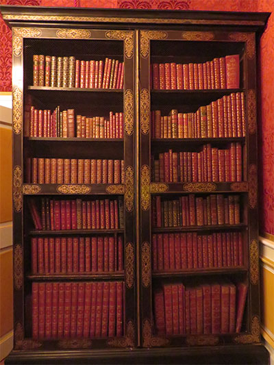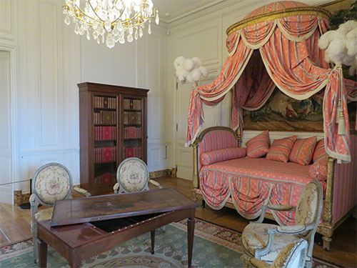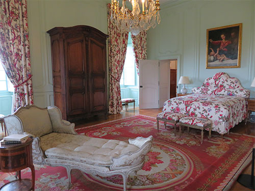 We went upstairs to what was once the banqueting hall, where the fireplace of carved walnut, rested below the Hautefort coat of arms, the same we had seen over the front entry. Then we went through the Madam’s rooms. There was her drawing room, with her daybed in pink, and her bed curtained with a Turkish canopy in her bedchamber. Both suites of rooms were filled with the furnishings and paintings from the 17th to the 19th centuries. A painting that hangs in one of the rooms with the title of “A Young Shepherd Pursuing his Flock,” was recently authenticated as a work by Fragonard.