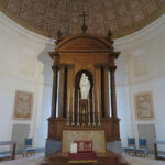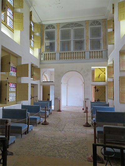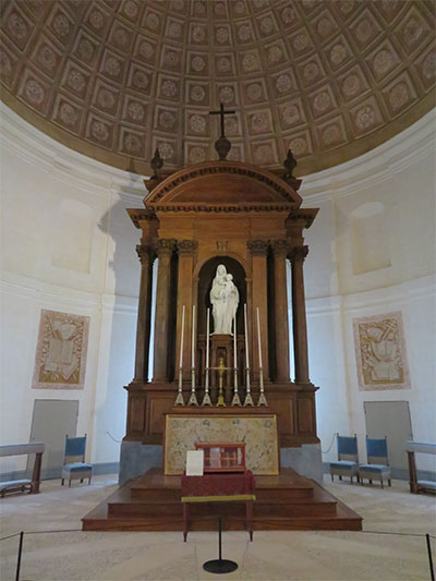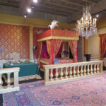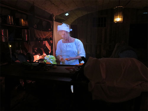 Then we went downstairs to the kitchen. We first came to the steward’s office with papers filling his messy desk. We pushed another audio button and heard him speaking aloud to himself about the costs of running the chateau. Within the kitchen, projections were seen of kitchen workers prepping food. At the end of the room, another projection of the steward is seen, yelling from the door, instructions to the cooks. There were other rooms that were just as interesting: the chapel with a Maltese cross on the floor and an all-seeing eye in the cupola, the tapestry room with 16th century Flemish tapestries, the movie room with a royal bed and photographs from two films produced on the premises: Ever After, A Cinderella Story (1998), and Eye of the Devil (1966). The outdoor covered gallery was also impressive, along with the front courtyard.