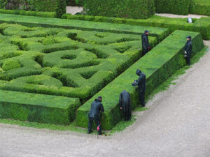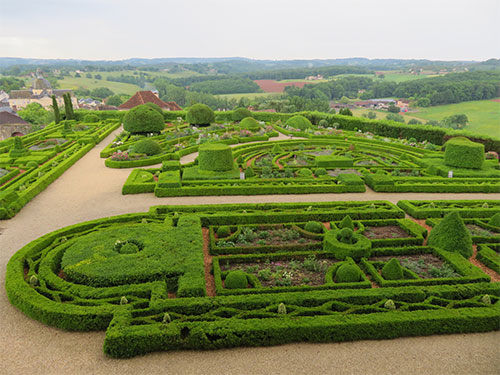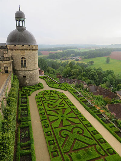 Perhaps because the family lived through the experience and had actually put it all back together, was in itself extraordinary; but also, the French gardens that surround the castle were even more so. They are typical with symmetry, geometric parterres, topiaries, alleys with trimmed hedges, and sectional areas with hedge designs, centered with flowers. It was early in the season for this garden, so the explosion of color that would normally be there was subdued, and the rain had beaten some down. Five gardeners were working while we were there. But the classical paths and boxwood plantings were perfectly laid out, even within the waterless moat.
