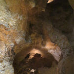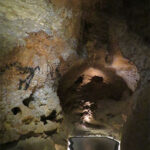 It continues with the Axial Diverticulum, which is an area that bulges outward from the wall. It is decorated with cattle and horses, deer, and an ibex. From the Hall of the Bulls, to the right, we walked along the Passage, a gallery of around fifteen meters. The décor there was severely damaged by air, so it was nearly bare. In the extension of the Passage, it opened to the Nave, a corridor about twenty meters higher. The Nave continued with an undecorated section, where the walls were not suitable to draw on. Beyond that, there were four groups of figures: a footprint panel, a black cow panel, five swimming deer with large antlers, and one with bison drawings. They were accompanied by geometric symbols that have never been interpreted.