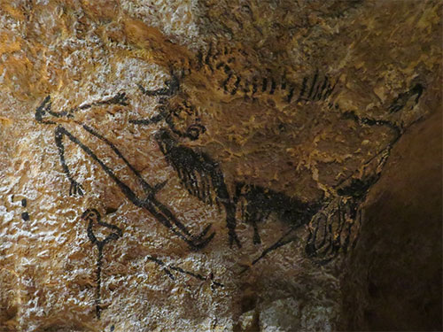Then there was another bulging area that was along a narrow corridor of about sixty-five feet, of large cats. They appeared to be urinating to mark their territory. There was also a horse, unusually seen from the front. The Apse was a round room, opening toward the west at the junction between the Passage and the Nave. The gallery contained over a thousand engravings, most superimposed on other paintings, and it contained the only reindeer depicted in the cave. The Well opened at the bottom of the Apse. Access to it required a descent of approximately 4 to 5 meters to the start of the lower network. We did not have access, but could look down into it. The drawings within (reproduced in a display room at the end), showed a semi-reclining man with an erect penis, the head of a bird, and with only three fingers. On the left was a rhinoceros and a horse. A sandstone lamp was found nearby. It is thought that this may have a mythological meaning.