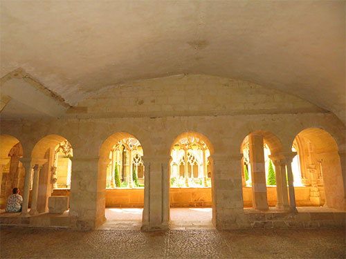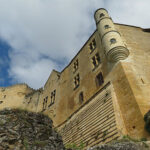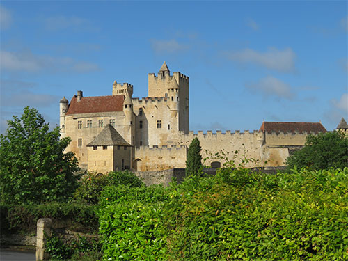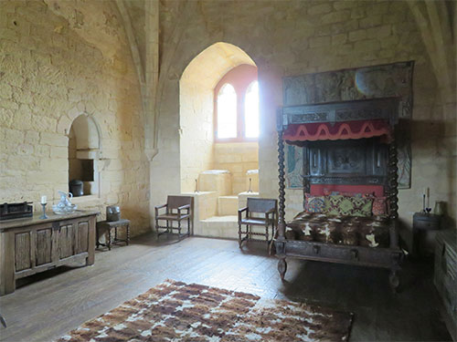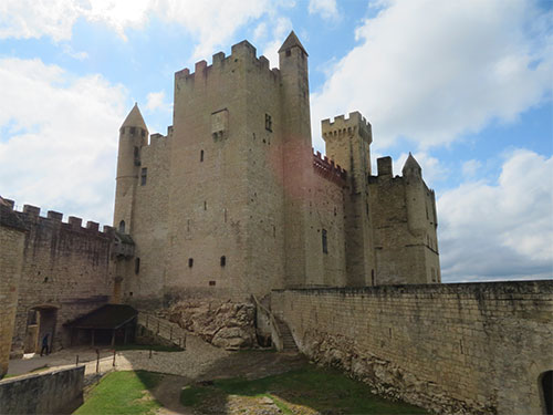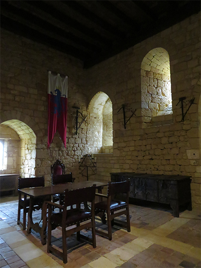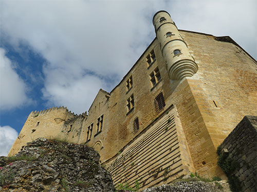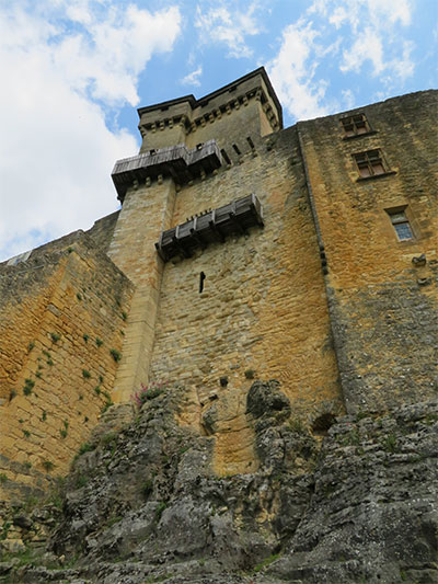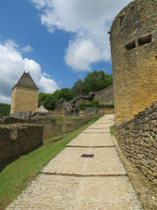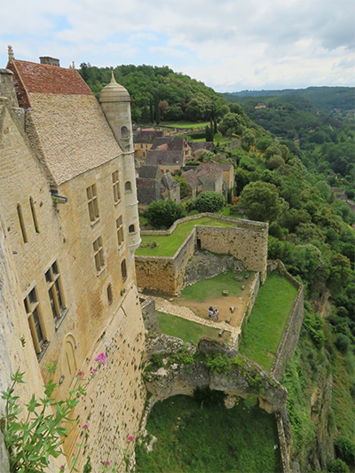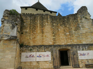 We were able to drive to the top of the hill where Beynac castle sits, and get the closest parking possible. Then we walked a short distance to the castle to enter. The renowned and well-preserved castle sits high on a limestone plateau well above the town. It was built in the 12th century by the barons of Beynac to block the valley from invaders. When Adhemar de Beynac died, Richard the Lionheart, then King of England, offered Beynac to his roadmaster, Mercadier. But he was assassinated so it reverted to the family and was held by two brothers. During the Hundred Years’ War, it was one of the strongholds of France. The castle has been left intact with a double enclosure, Romanesque keep, a watchtower, spiral staircases, buttresses, crenellated terraces, and apartments have retained their woodwork, some painted ceilings, frescoes, and Renaissance fireplaces.
