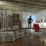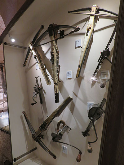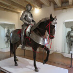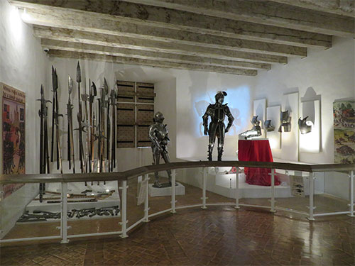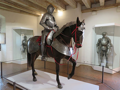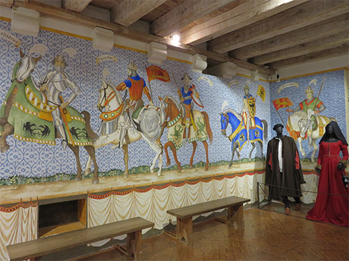 One of the rooms was the Nine Worthies, a presentation emphasizing the highly prized nobility at the end of the Middle Ages, which is seen in a mural painting that surrounds the room. Three knights from three different periods are represented. From the Old Testament are Joshua, David, and Judas. From Greco-Roman antiquity, Hector, Alexander the Great, and Julius Caesar; and from modern Christian times, King Arthur, Charlemagne, and Godfrey of Bouillon. Each is drawn with the weapons and defensive equipment of their time, and several rooms display these articles of battle.