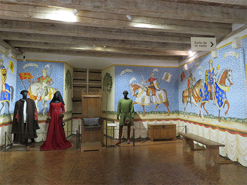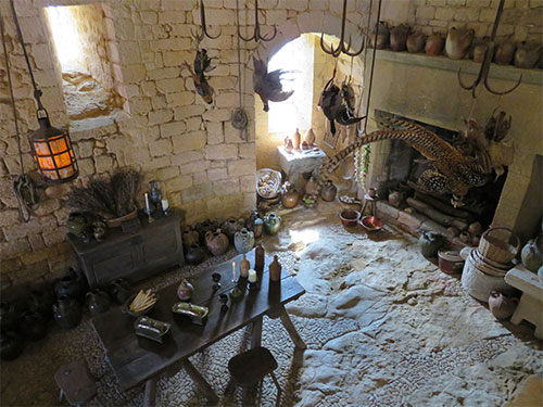There were many rooms with displays. One was the armory room with dressed knights, a full-size model of a knight mounted upon a taxidermy horse, and lots of weapons on display lined the walls. There was a kitchen, the king’s chamber, and a small theater with a short film on the history of the castle. Another room had a miniature display of the castle and nearby town, with a recorded voice that repeated in French and in English, the history of a key battle, showing lights where action had taken place.