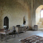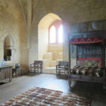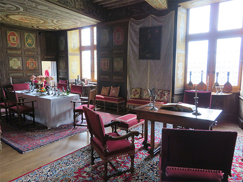 On the inside of the castle, there were many rooms to see; some with only hanging tapestries and open floors, some with just a table and bed, and some fully furnished with carpets, painted walls and ceilings, paintings, musical instruments, and tables dressed for a meal. All of which presented an excellent idea of how the castle might have once been decorated. On a lower floor was a kitchen, showing the rough stone on its floor, goods for food preparation, and a dining table with open slots at the ends, where soldiers would put in their swords before sitting down to eat.