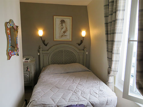 Our train arrived about 3:30, and we disembarked. We had to haul our luggage three blocks away to our hotel, the Hotel des Bains on Rue Delambre. We were surprised to be given a room on the sixth floor, at the top. We actually had to go to the end of the hallway, open a door to the outside and cross a small landing to room 666. If the room in our last hotel was small, this was tiny. At least it had a full-bed, a small desk and a clean bathroom. A tall window looked out over nothing but other roofs.