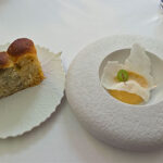 Then we got a palate cleanser of a tiny scoop of celery sorbet on top of a granulated yuzu. The main plat was next. It was a heart of sautéed sweetbreads with a grilled oyster and one puffed potato, and it all sat in a light beef au jus. I typically don’t like calf thymus, but I did eat three bites. It was tender and succulent with only a slight gamey flavor. After this, there was cheese. A cart was rolled forward with a choice of eight different cheeses. We were already full by then, but how could we pass up cheese?! We each had a different selection and shared.