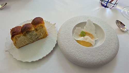 Another appetizer came, in a white round bowl that looked like a partially collapsed bubble, which had a small dip in the top, containing a creamy puréed egg with herbs and a curled rice cracker on top. This came with brioche bread that was actually baked with three different flavors in one slice: a square inch of tomato bread, one of seaweed, and one of lemon.