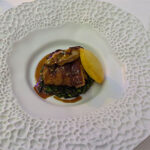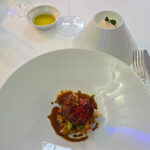 We had a waiter and a sommelier, and they offered two different menus; the Discovery Menu and the Signature Menu. We went for the second one. We were given excellent attention and rapid service, with choosing a wine and then all the courses began. The first was a series of appetizers. We were brought an oblong white plate with three things: two heavily creamed foie gras tartlets with soya droplets on top; two tiny glasses with a quiche Lorraine-type mousse with tiny spoons; and a seaweed cube that looked like it had been lightly breaded and baked with a drop of anchovy paste on top.