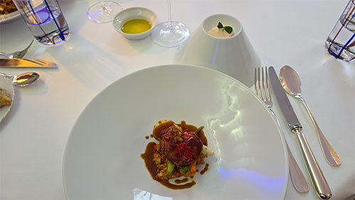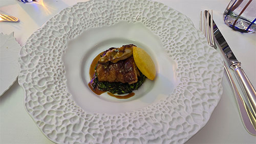 The first full course consisted of three items. One was Kamchatka king crab and caviar from the Petrossian house, which sat on a disc of string-cut celery root remoulade with cherries, and in another small oval bowl was served a spider crab bisque ice cream. It was odd to taste a salty, seafood ice cream, but the slightly sweet crab foam they spooned over it, helped to somewhat lessen the salty aspect.
