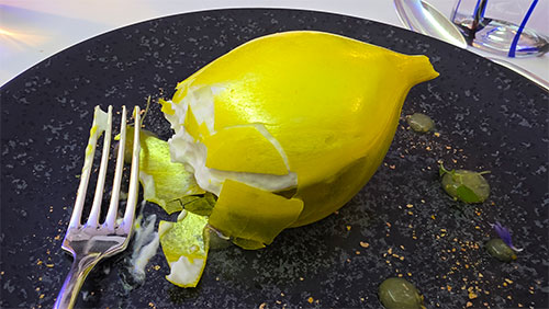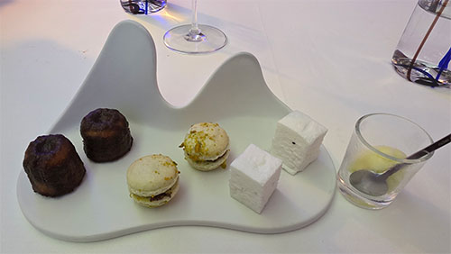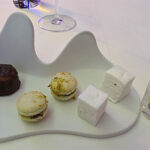 Finally, it came to desserts. The first was beautiful. A bright, shiny, blown puffed sugar lemon appeared filled with a pastry cream. In the very center was a kiwi-like sorbet, and a kiwi syrup dotted the plate around the lemon. The final course was a second dessert platter with three items. One was a small square of a violet marshmallow, the second was a vanilla macaron with a chocolate filling, and the last was a sweet-coated canelé, with its signature fluted and caramelized edges and a creamy custard inside.