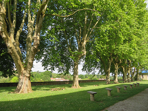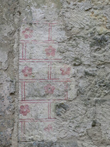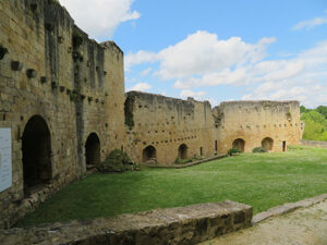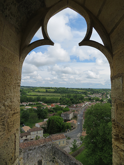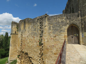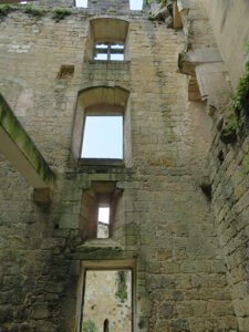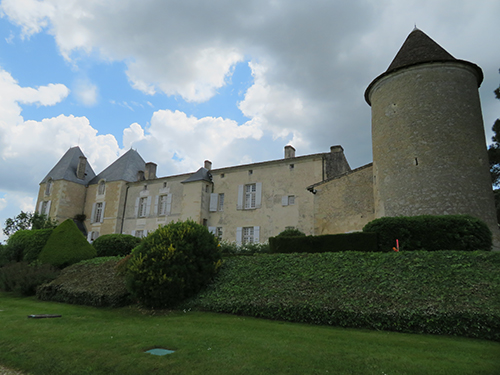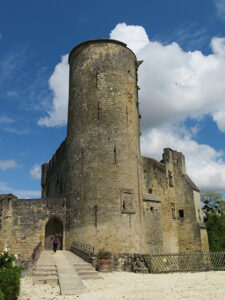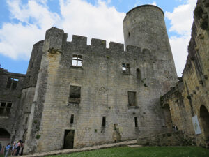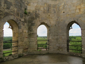 Rauzan Castle was built between 1310 and 1350. A rebuilt drawbridge allowed access. One enters through a Gothic doorway with a very nice palm tree decoration over the Gothic arch. We were able to explore a defensive tower with four floors and two vaulted areas. Large casement windows showed that they had been added to the building later. In one room a large fireplace remained, and above was a walkway between the watchtowers.