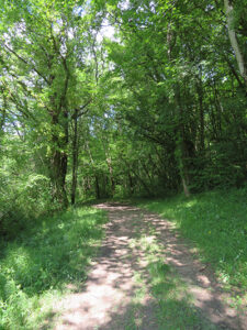 We rested and then hiked back, seeing butterflies along the way, through dappled light of trees alongside the old farmers road.