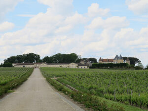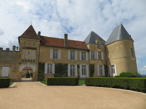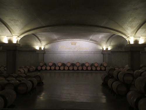 It was time to head to Chateau d’Yquem for our tour and wine tasting. We drove down a very long white gravel drive that led straight to the chateau. The impressively long building had several square and round towers with gray pointed cone roofs, which added an element of fairytale appearance. The white building struck a beautiful contrast to the dark green of the vineyards laid in perfect rows that ran all along each side of the road, with a bright blue sky and puffy white clouds above.