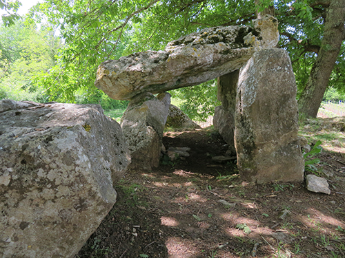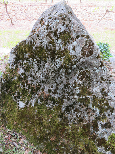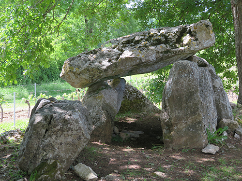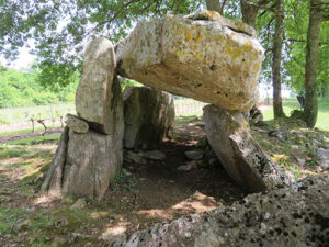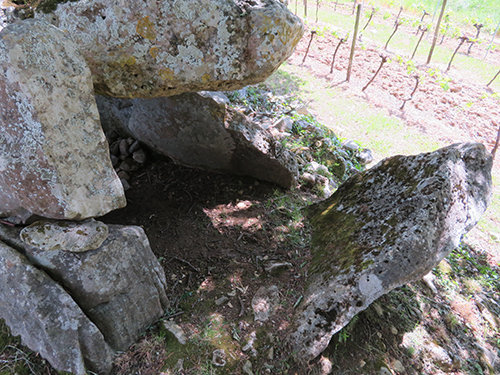 From there, we decided to find the Curton Dolmen, not too far away off a country road. We followed the GPS map on Vere’s phone where the streets became smaller and narrower and turned to gravel, and stopped when it turned to dirt. We then parked and began to walk a trail, muddy from recent rains. The path slowly wound its way upward to a flat open area where a local farmer had planted rows of grape vines.