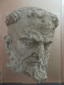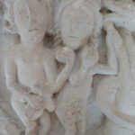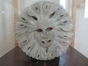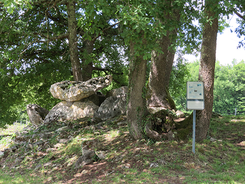 In the center of the field, on a rocky mound, the dolmen rested between several large trees. One large knobby stone rested across two side stones, and the head stone slanted outward. The bones of five men and three women had been found there with burial goods. We finally located the headstone markings, with what looked like horseshoe shapes, facing up and down, and to the side, indented rays fingered outward.