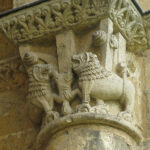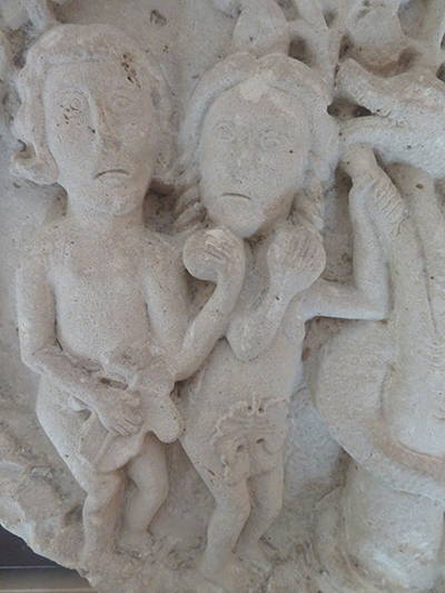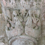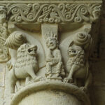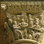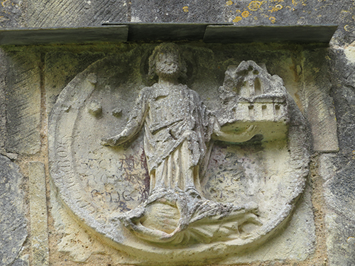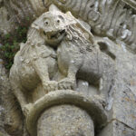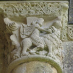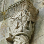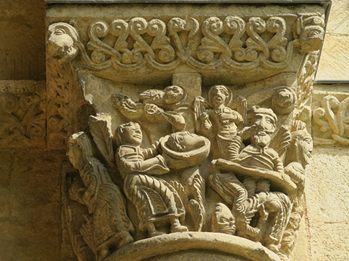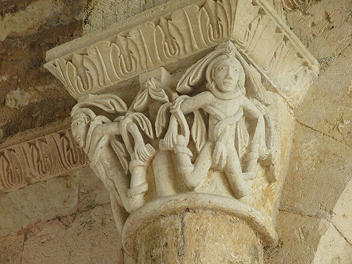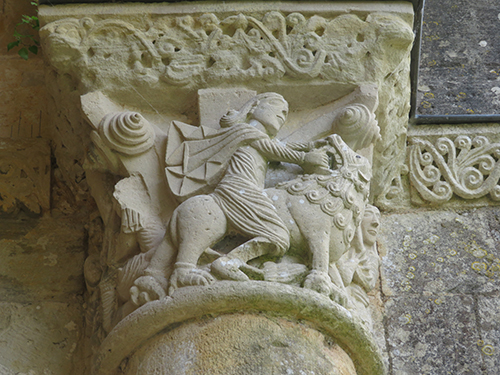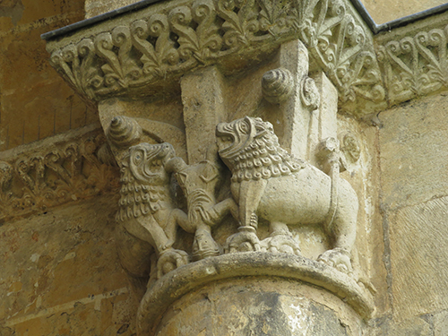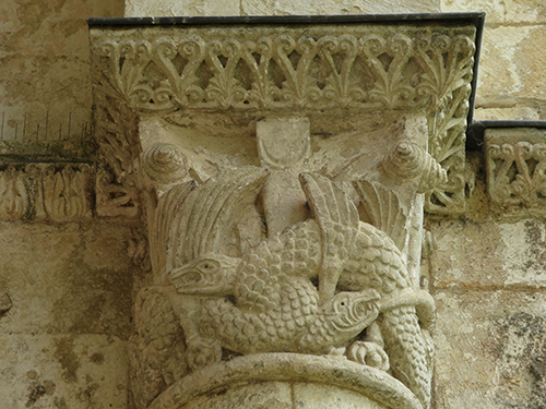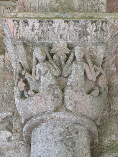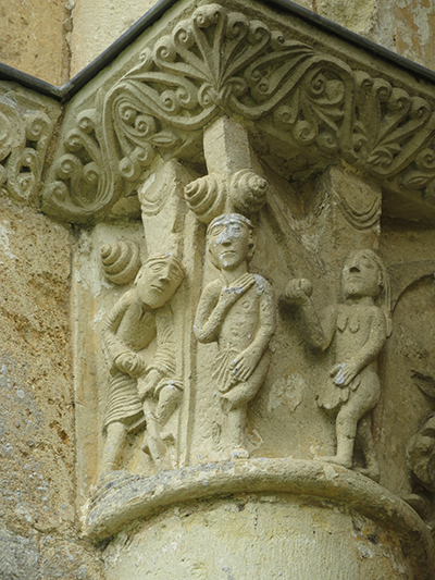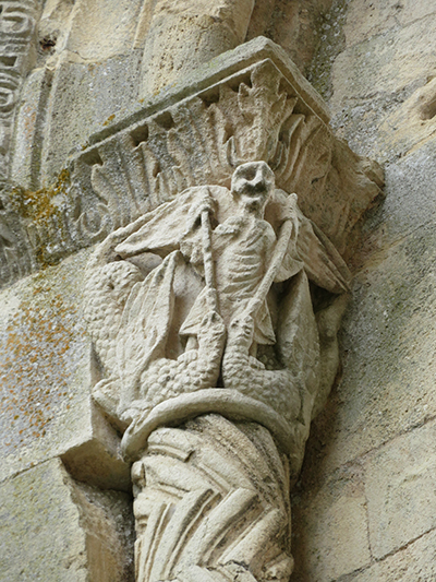 At the entrance we were given a laminated booklet that explained all the remaining stone carvings. The town was lucky, as at one time the king wanted to completely bring down the rest of the abbey, but the cost to do so seemed too high, so it was left. Wide green grassy areas covered what had been the grounds, cloister, and many ground floor rooms. Large colorful alphabet tiles marked where explanations in our booklet could be read. Capitals on top of many the columns were still decorated with scenes from the bible: mermaids, Samson, dragons, King Herod and Sheeba, and many others, as well as leaf and flower designs.