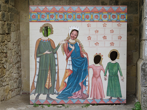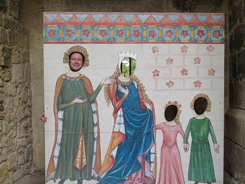 When he returned down to the ground, we met up, and took turns taking pictures of each other with our heads through headless boards with painted medieval dress. Then we visited a room that led to the dungeon, and another that had been the bakery, and finally the privy. There wasn’t much to see, but the surrounding stone walls still presented a fine medieval fortified and historic castle that once belonged to the crown of England and the son of Eleanor of Aquitaine.