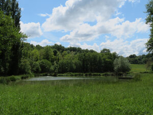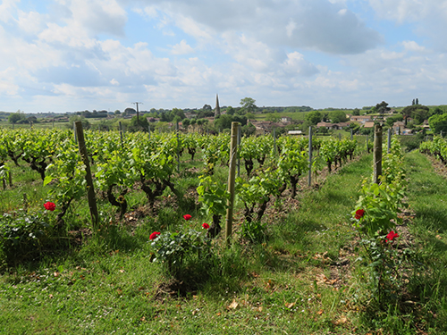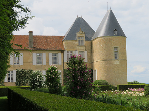 For our tasting, we chose the Four Senses Tour for $50 each. First, there was our private tour of the property with our guide, a young woman named Aline. She began by taking us first to the front of the chateau home, just inside the front entry gate, where she told us about the history of the owners and the property. A lovely green lawn with blooming flowers was encircled by a curved gravel road. The front walls of chateau’s long building were covered in green ivy. White shutters surrounded white window frames, a reddish-brown tile covered the roof, and a square tower was at each end. A grand double curved stone stairway led up to a landing at the front door.