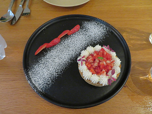 It was only noon, but after having had wine, we were hungry. For appetizers, Vere was served two small blocks of foie gras, one sliced with some red pepper on it, and one with sliced strawberries and a bit of syrup. I had baby white asparagus that had been marinated in a vinaigrette and topped with bread crumbs. The description said that parmesan was included, but was missing. Then for the main courses, Vere had the demi magret (half a duck breast), served with a dark cherry sauce that had some red wine added to it. I had the chicken breast with a citron cream. We both had the au gratin potatoes, and then Vere had the strawberry and rhubarb tart. I was too full for dessert. Aside from the asparagus lacking finesse, everything else was delicious.