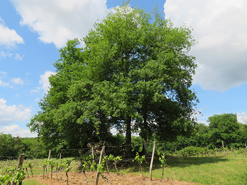 We were about fifteen minutes early for our appointment, but were offered a tour in English right away by a woman named Anna. She guided us out the front door and around to the right side, down a shaded arbor and out through a wing of a back building to stand outside on a bluff to view the vineyards. She showed us several large nearby trees that overlooked the impressive expanse; one of which the soldiers during WWI had planted when the chateau was used as a military hospital. Then we walked down some steps directly to the edge of the vineyard. Anna waved to a smiling woman who was working in the rows, and we walked over to her. The mature woman, wearing a working apron, showed us how she was cutting off the secondary growths from the main root stock so that the main branches would grow sturdier, and then she would help twine them around the wires that were strung above. We noticed wildflowers growing between the rows, and she said they helped to add nitrogen to the soil to make it richer.