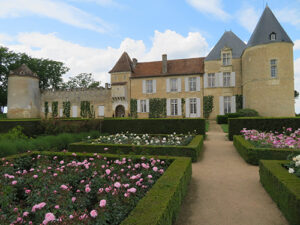 We left the building once again, and she led us through the garden, where roses were in full bloom, pointing out to us a yellow rose that was actually called the Sauternes Rose. Then in through a side door to a small cushy lounge where we sat for our Sauternes tasting. She asked if we would like some background music, and we were shocked to see a turntable with vinyl records stacked up, the front covers showing Dark Side of the Moon and Queen. We could only surmise that listening to such progressive rock with its thematic integrations like heartbeats and cash registers would help promote tasting and purchasing one of the most expensive wines in the world. Diplomatically, having long ago left behind the likes of listening to the psychedelic use of synthesizers, we said that we would prefer to just hear her lovely voice. She left the room for a short time and then brought in a 2016 bottle of Chateau d’Yquem. She gave us a generous pour of half a glass each, and as we sat, twirling the amber liquid and inhaling its fragrant bouquet, we chatted. She talked about some of the oldest wines that were housed at the chateau and other aspects of growing and tasting wine.