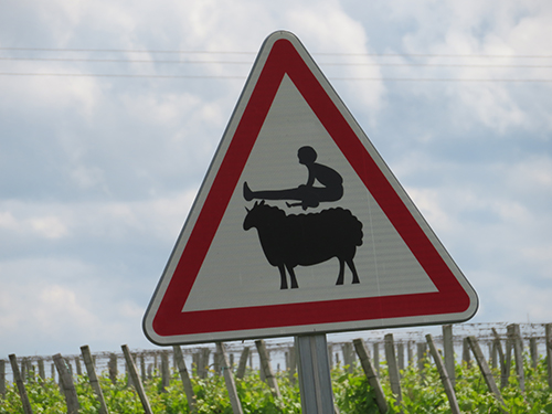 On the way to a ruined abbey, we began to pass an old broken-down train. Vere opted to stop so he could take some pictures of it. The train had last pulled into the old train station in 1875. There it remained and the station eventually turned into a restaurant. The train was funny to look at, as black and white pictures of people looking out the train had been affixed to inside the windows, to make it look like the train was full of people. It was cleverly done. On the side of the road we saw this local sign, letting motorists know to watch for sheep, as a sheepherder is nearby.
