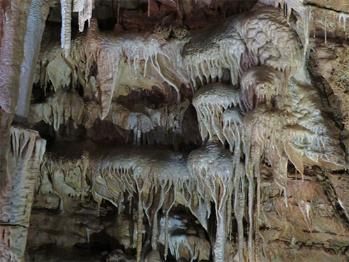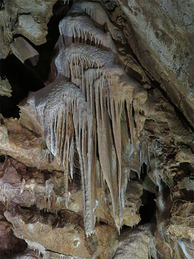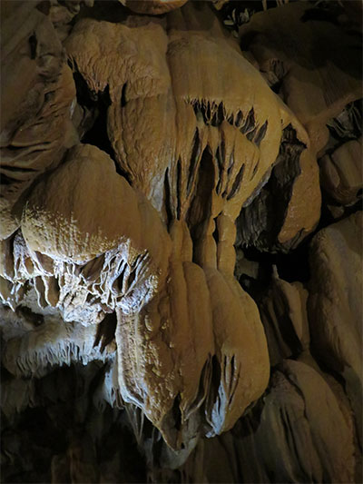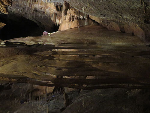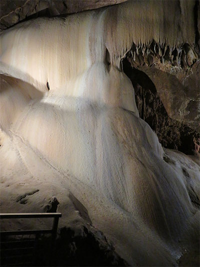 In the lake gallery, one lake was especially large, and the reflection made it look deep, but the water was quite shallow. At the other end, there were successive shelves of limestone where water spilled over onto the next. In another room, a stalagmite looked like a hand pointing upward in order to touch with an index finger, the descending stalactite. Also, a wide limestone formation, appeared as a frozen white waterfall, and a stalactite curtain sparkled like diamonds, dripping into the water. The temperature in the caves stayed constant, between 55-57º F.