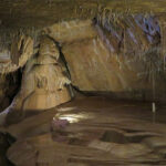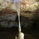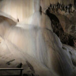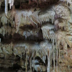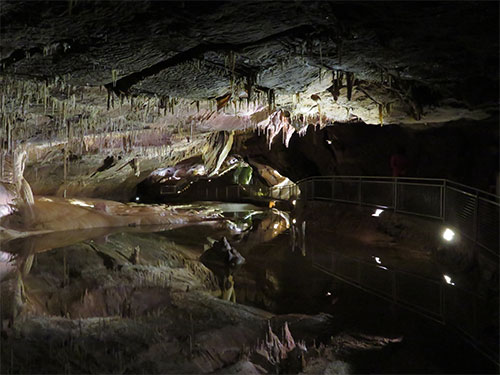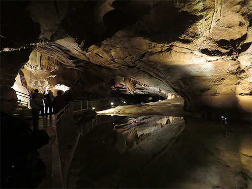 When the train stopped, we got out, and had a choice of either stairs or an elevator down four stories, to reach a trail where a guide would take us further. We were told we would see twelve different galleries, and each one had been named by the shapes of the concretions, although we only learned a few of the gallery names. There was the Hall of Tarasque, which had a formation resembling a dragon in a tortoise shell. The Hall of Chaos featured large limestone pillars. The Hall of Mirages had reflective lakes. The Hall of Wonders was the largest, reaching over 200 feet, and was known for its hundreds of stalactites that hang down and drip water. When these were lit with an ultraviolet light, they appeared as tiny raindrops falling in mid-air. The Black Light Hall illuminated certain rock formations. And there was the Three Fates Room.