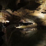 Between 1865 and 1870, Édouard-Alfred Martel and Count Murat de Salvagnac, descended into the entrance shaft in a large basket. But they did not notice the small opening that leads to the large cave gallery. In 1889, the speleologist Édouard-Alfred Martel and a local village priest, discovered the underground river of the Padirac chasm. They only got so far, when the water got too deep to trudge through, so they returned the next day with a small boat. They got much further then, and explorations continued for years with different speleologists and explorers. The cave was first opened to tourists in 1898, with a walkway and metal staircase. In 1900, electric lighting was installed, and today over 500,000 people annually enter the cave, which holds the record for the most attendance for underground tourism in France.