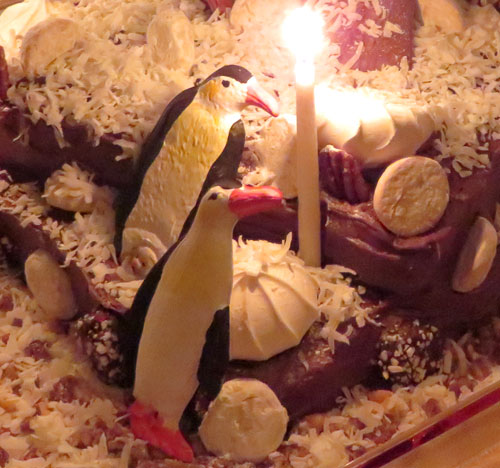 The mountain was formed with several odd shaped cakes of chocolate and covered with layers of milk and dark chocolate, topped with coconut for snow. Small flags point to the three types of creatures: giant penguins, aliens (which were children’s monster candles), and a shoggoth made of dark modeling chocolate with a dozen red cherries for eyes. Creepy but oh so delicious!