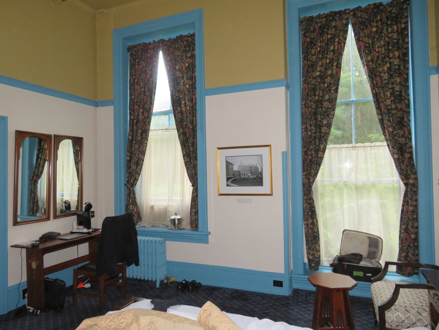 When we had completed reading that introduction, the woman escorted us down several halls to come to a part of the building where guests stayed. She showed us a large bright and airy room with a high ceiling. The walls were white, but all the wood framing and even the heating unit were painted a sky-blue, and the carpet was a dark blue. The king size bed was a type of wooden slay bed, with a Yaxley-like paneled headboard, curved sides and a low footboard. The bathroom was also large and tiled. Both rooms had very tall windows that faced a large grassy lawn and trees. A continental breakfast was included, but not full meals. One is also gifted with a hardcopy of Pierrepont B. Noye’s book, My Father’s House.