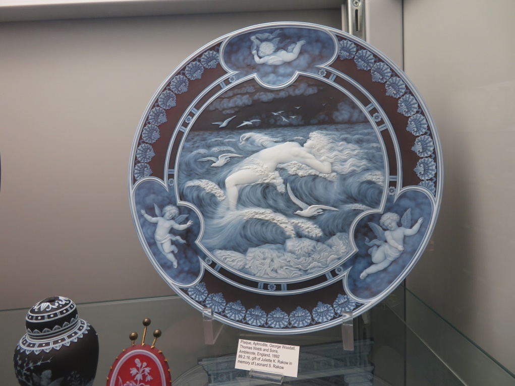 There was this small miniature French glass-painted piece of a reclining goddess and cherubs, a vase with mermaids, a blue glass table, and a Murano chalice.